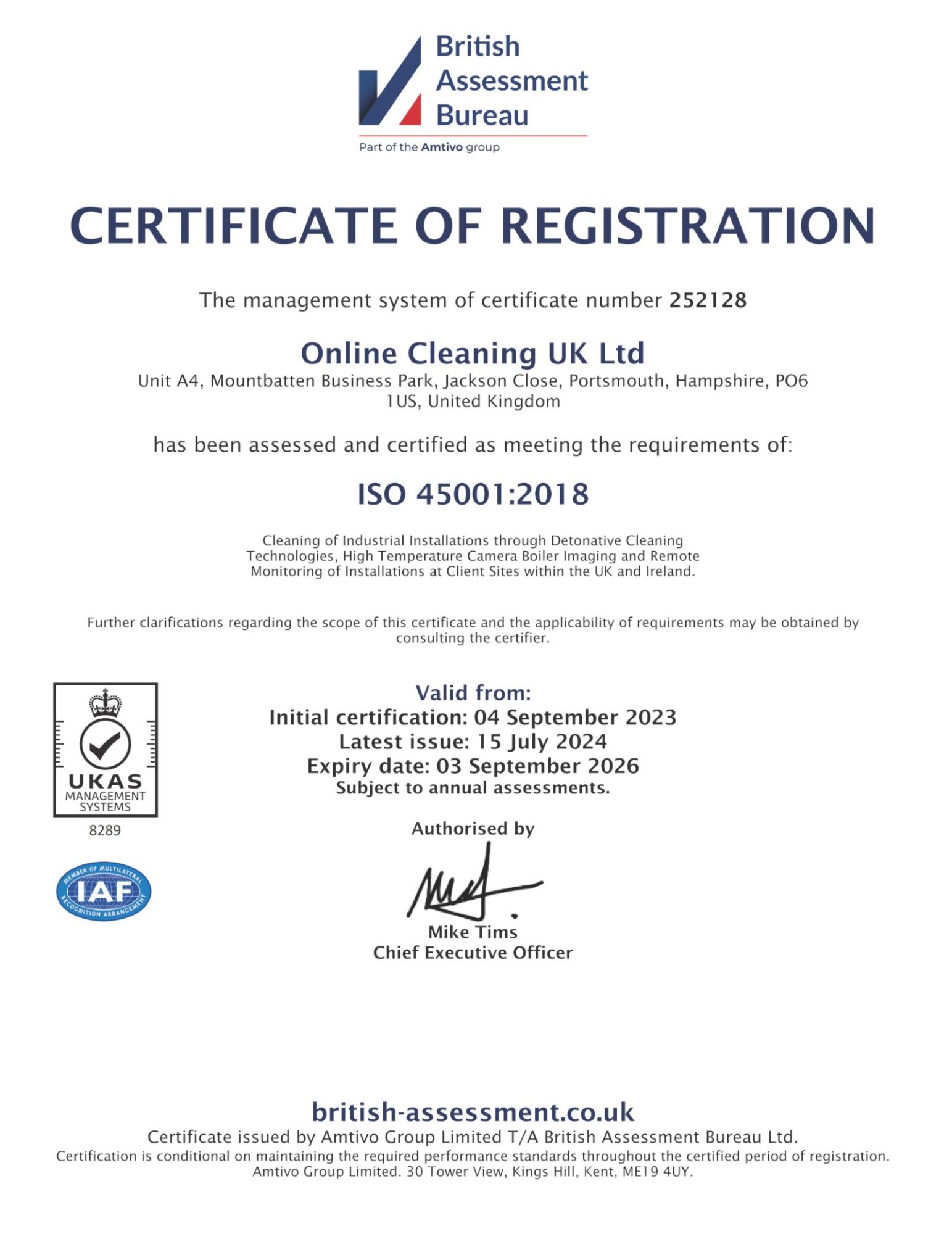The recertification process involved a comprehensive audit of the company’s management systems, conducted by British Assessment Bureau, an accredited certification body. The audit confirmed that Online Cleaning UK continues to meet the rigorous requirements of both standards.